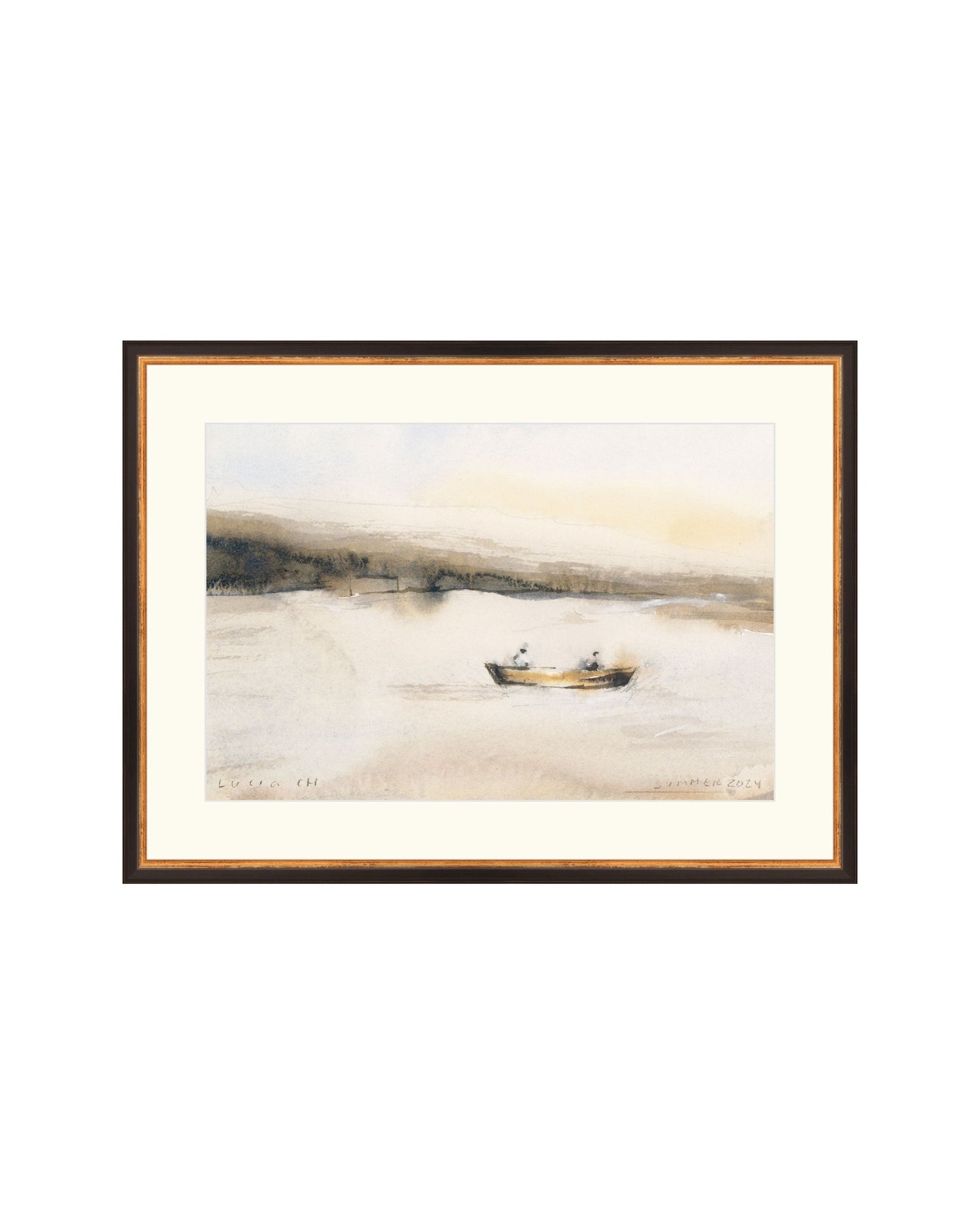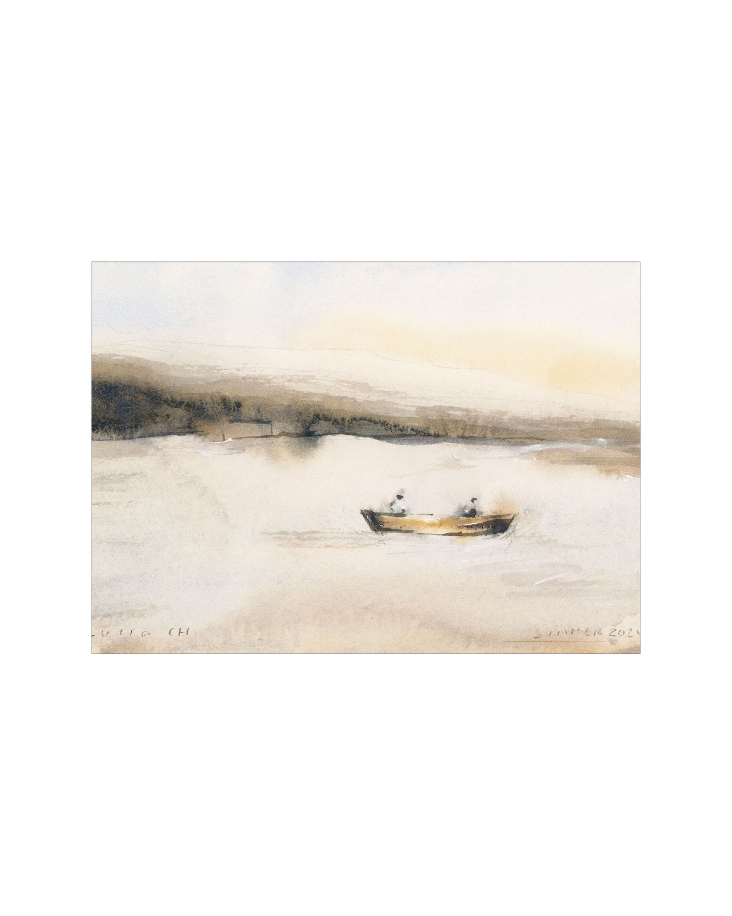 This watercolor landscape captures a small boat resting on still water at the edge of day.