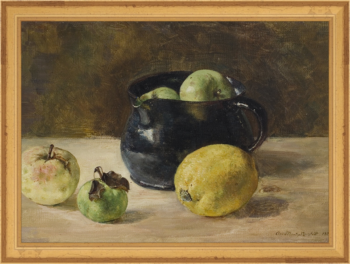 Framed Still Life With Fruits. Frame: Traditional Gold. Paper: Rag Paper. Art Size: 8x11. Final Size: 9'' X 12''
