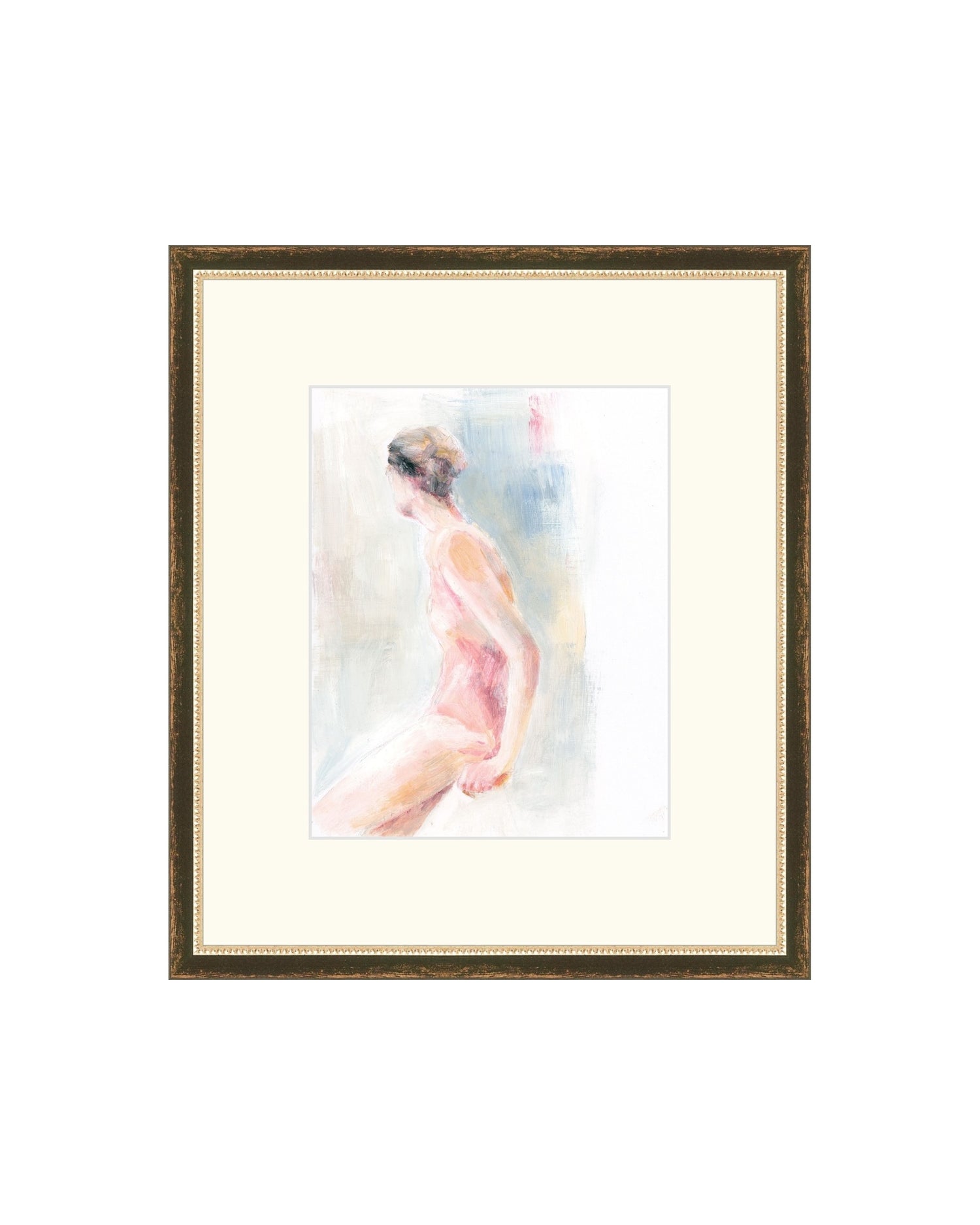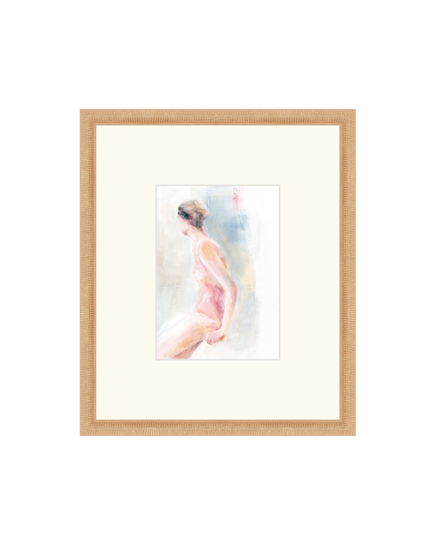A soft figurative study of a ballerina, painted with loose, layered brushstrokes. A muted palette and blurred edges capture a moment of rest and grace.