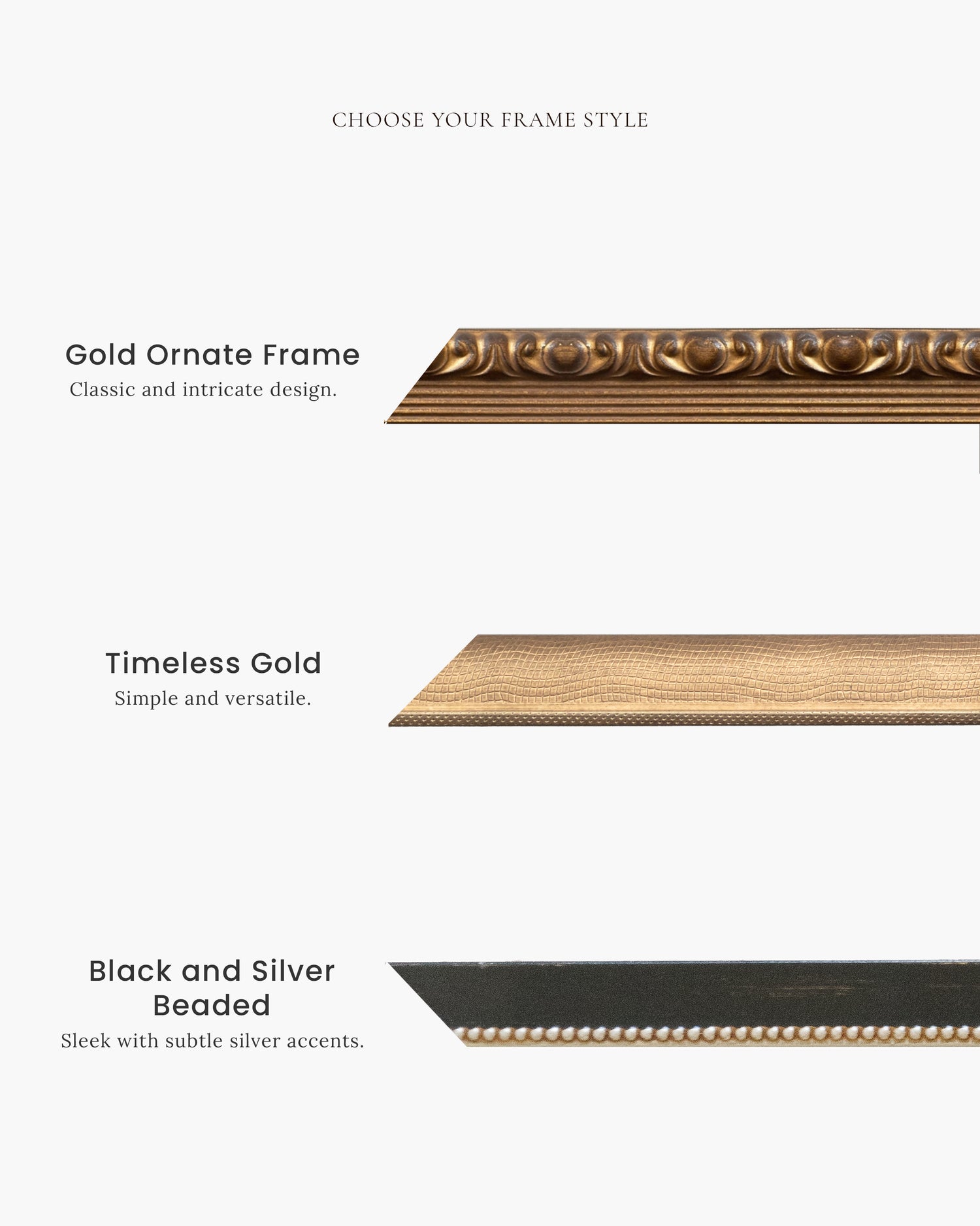 - Handcrafted Hardwood Frames: Natural wood, black, gold, silver, and more.