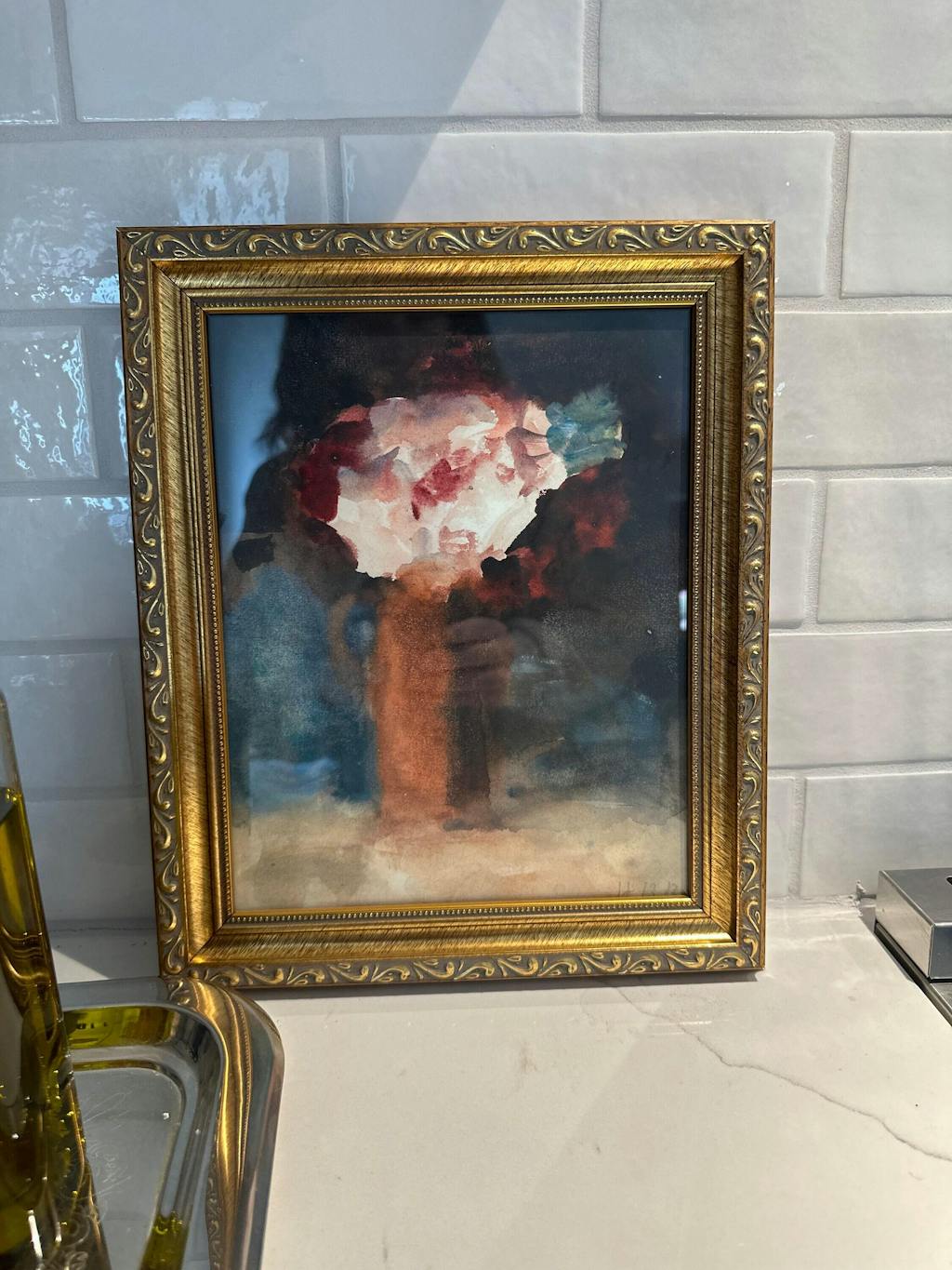 Loose watercolor brushstrokes with deep blue hues make this lovely still life painting a beautiful addition to any space.